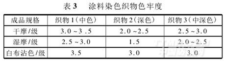 涂料染色紗織成布料的色牢度見表3。