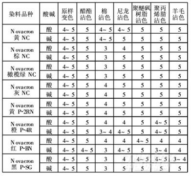 從表5可以看出,NovacronNC系列染料的汗?jié)n牢度很高,但Novacron棕NC和NovacronNC橄欖綠NC的棉沾色只有3級,可能是染料濃度太高,浮色清洗不凈所造成,需加強(qiáng)水洗或固色處理。