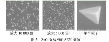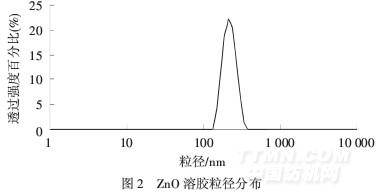 由圖2可見,ZnO粒子平均粒徑在0.25μm左右,粒徑分布相對(duì)集中,大致分布在0.13~0.37μm,具有很好的置信度.