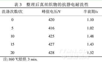 由表3可以看出,隨著洗滌次數(shù)的增加,對(duì)真絲織物抗靜電性能影響不大.說明整理劑與纖維間結(jié)合得很好,ZnO溶膠處理后織物的抗靜電性能具有很好的耐洗性.洗5次時(shí),抗靜電性能變好.原因是整理劑與纖維之間形成了較好的結(jié)合,此時(shí)織物呈收縮狀態(tài),粒子間空隙較小,導(dǎo)電膜較致密.