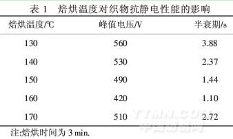 由表2可以看出,隨著焙烘時(shí)間的延長,峰值電壓和半衰期不斷降低,抗靜電性能不斷增強(qiáng);3 min時(shí)峰值電壓和半衰期達(dá)到最小值;超過3 min后,隨時(shí)間的延長,峰值電壓和半衰期不斷增大,抗靜電性能減弱.原因是焙烘時(shí)間過短,整理劑在纖維表面未能形成連續(xù)導(dǎo)電膜;只有當(dāng)時(shí)間合適,才能產(chǎn)生良好的抗靜電效果;時(shí)間過長,導(dǎo)電膜分裂,抗靜電性能下降.因此,較佳焙烘時(shí)間為3 min.