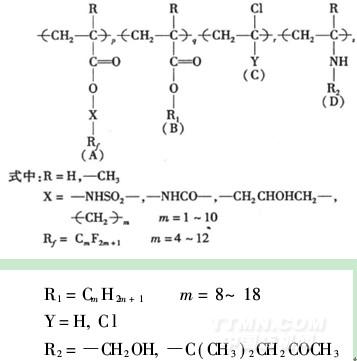 20世紀(jì)50年代,美國杜邦公司率先以四氟乙烯乳液作為織物整理劑發(fā)表了專利[1]; 1953年,美國3M公司研制成功以全氟羧酸鉻絡(luò)合物為主體的拒水拒油織物整理劑[2]。由于以上產(chǎn)品在性能等方面的局限性,很快被含氟丙烯酸酯聚合物取代。1956年, 3M公司成功研制了以Scotchgard FC-208為商品名的織物拒水拒油整理劑[3]。60年代起,日本、西歐等國也相繼研制成功此類產(chǎn)品,產(chǎn)品性能日趨完善。有機(jī)氟拒水拒油整理劑一般是氟烷基丙烯酸酯與各種乙烯基系單體的聚合物,其結(jié)構(gòu)如下[4]: