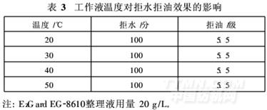 由表3可以看出,滌綸拒水拒油效果受EzGardEG-8610工作液溫度的影響較小,具有較廣的溫度適用范圍,能適應印染車間溫度的變化。