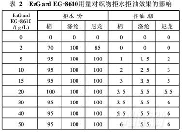 EzGard EG-8610用量對織物拒水拒油效果的影見表2。