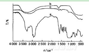 圖3改性劑A和改性前后納米TiO2的紅外譜圖(a為改性劑A,b為未改性納米TiO2c為改性后納米TiO2)