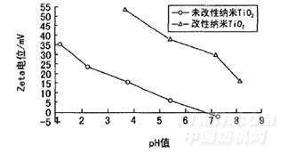 分別取一定質(zhì)量濃度的未改性納米TiO2溶膠和改性納米TiO2溶膠,用NaOH調(diào)節(jié)溶膠pH值。在不同pH值下,測定納米TiO2溶膠的Zeta電位,結(jié)果如圖4所示。