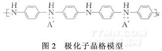 聚苯胺經(jīng)一般的質(zhì)子酸處理后,就可取得良好的摻雜效果,電導(dǎo)率提高十個(gè)數(shù)量級(jí)以上,基于不同的結(jié)構(gòu),人們提出了不同的摻雜反應(yīng)機(jī)理,大多數(shù)研究者基于聚苯胺的結(jié)構(gòu)模型,認(rèn)為聚苯胺分子中一定量醌結(jié)構(gòu)的存在是聚苯胺具有導(dǎo)電性的重要因素,導(dǎo)電機(jī)制較有說服力的是1987年MacDiarmid提出的極化子晶格模型[7](圖2)。