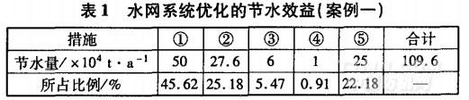 某公司年產(chǎn)3000萬(wàn)ITI各類織物的印花、染色產(chǎn)品。主要用水設(shè)備有皂洗機(jī)、氧漂機(jī)、絲光機(jī)、水洗機(jī)、定形機(jī)、印花機(jī)等。為了減少新鮮水的取水量,減少企業(yè)運(yùn)行成本,從2000年開始,公司就開始對(duì)水網(wǎng)系統(tǒng)實(shí)行優(yōu)化,并取得如表1所示節(jié)水效益。水網(wǎng)系統(tǒng)優(yōu)化的總思路和具體措施如下: