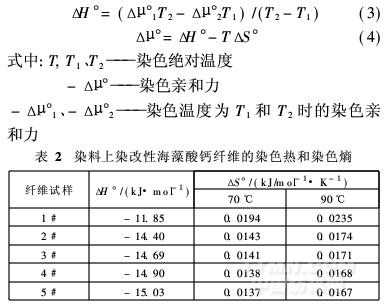 染色熱是每摩爾染料從染液轉移到纖維上所吸收的熱量,標志著上染過程中各種分子間的作用所產生的能量變化,其計算采用式(3);染色熵是每摩爾染料從染液轉移到纖維上所引起的物系熵變,其計算采用式(4)[22]。根據(jù)式(3)和(4)可計算出直接染料湖藍5B上染PAMAM改性海藻酸鈣纖維的染色熱(ΔH°)和染色熵(ΔS°),所得結果見表2。