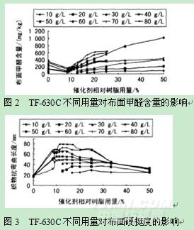 從表2和圖2、圖3可知,隨著樹脂用量的變化,TF-630C的用量也應(yīng)作相應(yīng)調(diào)整。這是因?yàn)楹线m的催化劑配比,可以使樹脂在較短的時(shí)間內(nèi)反應(yīng)充分,有效控制游離甲醛含量。如果催化劑用量偏小,會(huì)使反應(yīng)不充分,導(dǎo)致游離甲醛含量增加;如果用量偏大,則會(huì)使反應(yīng)可逆,造成樹脂水解,游離甲醛含量增加。TF-630C作為TF-630的催化劑,具有合適的反應(yīng)活度,催化力大,可在較低溫度或縮短時(shí)間的條件下進(jìn)行焙烘,完成交聯(lián)作用。結(jié)合工廠應(yīng)用情況,一般輕漿(10~30g/L)可采用催化劑用量的比例為1/4~1/8;中漿(30~50g/L)為1/5~1/8;重漿(大于50g/L),為1/6~1/10。