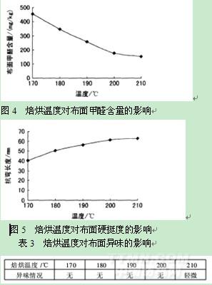 從表3和圖4、圖5可以看出,隨著焙烘溫度的提高,布面硬挺也明顯增加,布面甲醛含量隨之減少。當(dāng)焙烘溫度升至210℃時(shí),布面有輕微的異味出現(xiàn)。結(jié)合工廠實(shí)踐,建議焙烘溫度以190~200℃為宜。