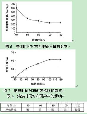 從表4和圖6、圖7可以看出,隨著焙烘時(shí)間的延長(zhǎng),硬挺度明顯增加,布面甲醛含量也隨之減少,但焙烘時(shí)間延長(zhǎng)至120s時(shí),布面有輕微的異味出現(xiàn)。結(jié)合不同焙烘溫度產(chǎn)生的布面效果,分析原因是,焙烘溫度過(guò)高,時(shí)間過(guò)長(zhǎng),易在樹(shù)脂反應(yīng)時(shí)產(chǎn)生三甲胺[(CH3)3N],而使整理的織物有魚(yú)腥臭[3]。因此,整理時(shí)在提高焙烘溫度的同時(shí)應(yīng)相應(yīng)減少焙烘時(shí)間,或在降低焙烘溫度的同時(shí)相應(yīng)增加焙烘時(shí)間,都能達(dá)到較理想的應(yīng)用效果。結(jié)合工廠工藝,克重小于100g/m2的織物,建議采用80~110m/min車(chē)速;克重100~200g/m2織物,采用70~90m/min車(chē)速;克重大于200g/m2織物,車(chē)速采用60~70m/min。