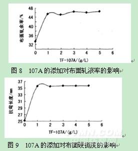 試驗(yàn)結(jié)果見(jiàn)圖8、圖9。由圖8、圖9可以看出,在織物滲透性比較差的情況下,添加107A,能加快工作液滲入織物,明顯提高布面帶液率,增加布面硬挺度。107A的用量控制在1~3g/L即可。