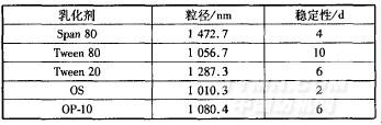 由表l可知,Tween80穩(wěn)定性最好,10d未分層,且粒徑較小。由于OP—l0中含有APEO,對(duì)環(huán)境有影響,所以不選。