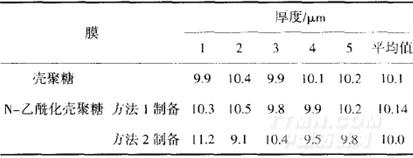 由表1可知,經(jīng)方法1與方法2制備的N-乙化殼聚糖膜與純殼聚糖膜厚度相近,說明殼聚糖膜經(jīng)N-乙?;幚韺穸鹊挠绊懞苄。?/p>