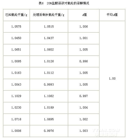 通過(guò)試驗(yàn)分析可知,80%甲酸法對(duì)氨綸的影響較大,重量損失百分率在-1.1%~-2.5%之間,超出了標(biāo)準(zhǔn)允差范圍,盡管經(jīng)溶解系數(shù)修正后,結(jié)果平均值可以接近真值,但誤差較大,不建議使用此方法檢測(cè)錦綸/氨綸混紡產(chǎn)品。三種方法中二甲基甲酰胺法、20%鹽酸法的測(cè)試結(jié)果基本接近于真實(shí)值,二甲基甲酰胺法是GB/T2910.12–2009中規(guī)定的方法,在日常檢測(cè)過(guò)程中可以優(yōu)先使用,20%鹽酸法可以配合使用。