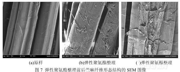 由圖 7 可知,未經(jīng)聚氨酯整理的苧麻纖維(圖 7(a))表面光滑,平直且顯剛硬;經(jīng)過聚 氨 酯整理后的苧麻纖維表面被部分包覆了聚氨酯(圖 7(b)),同時在部分苧麻纖維之間也形成聚 氨酯薄膜(圖 7(c))。苧麻纖維本身具有多孔性,在聚氨酯浸軋整理工藝中,部分整理劑滲入 纖維內(nèi)部形成交聯(lián),從而提高苧麻織物的壓縮性質(zhì);聚氨酯整理劑在苧麻纖維和織物表面的