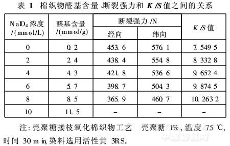 物后,纖維素大分子葡萄糖剩基中2, 3-鍵斷裂,得到二醛基纖維素,經(jīng)殼聚糖溶液處理后,在醛基與氨基之間形成席夫堿,從而在殼聚糖與棉織物之間產(chǎn)生牢固的化學(xué)鍵交聯(lián)。理論上,氧化棉織物中醛基含量越高,與棉織物發(fā)生共價結(jié)合的殼聚糖量越多,增深效果越好但要提高氧化棉織物中的醛基含量,必須提高棉織物的氧化程度,這樣容易造成棉織物強(qiáng)力損傷。表1為高碘酸鈉濃度與氧化棉織物中醛基含量、斷裂強(qiáng)力、染色K/S值之間的關(guān)系。