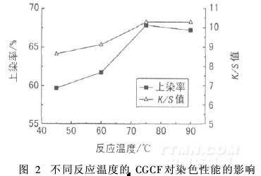 從圖2可知,隨著接枝反應(yīng)溫度的提高,染色織物的上染率、K/S值增大,提高接枝反應(yīng)溫度有利于獲得更好的染色效果。這是由于溫度高,殼聚糖分子擴(kuò)散快,大分子鏈熱運(yùn)動(dòng)加劇,分子能量提高;同時(shí),溫度高,殼聚糖溶液的黏度降低,這都有利于殼聚糖大分子與棉織物上的醛基接觸并向織物內(nèi)部滲透、擴(kuò)散。當(dāng)溫度超過(guò)75℃后,染色織物的上染率、K/S值變化不大。因此,合適的接枝反應(yīng)溫度為75℃。