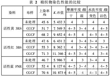 將醛基含量約為4. 3 mmol/g的氧化棉織物和未經(jīng)氧化處理的普通棉織物分別置于質(zhì)量分?jǐn)?shù)為1. 5%的殼聚糖溶液中, 75℃浸漬60 min,制得殼聚糖接枝氧化棉織物(CGCF)和殼聚糖涂覆棉織物(CCCF)。然后分別采用活性黃3RS、活性紅3BS和活性藍(lán)FNR染色,測(cè)試染色性能和染色牢度,并與未經(jīng)殼聚糖處理的棉織物進(jìn)行比較,結(jié)果見(jiàn)表2。