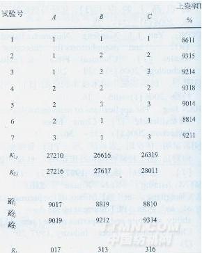 實驗得出最佳工藝:弱酸性黃染料1%(owf),滲透劑l.5g/L,元明粉10%(owf),pH值6,硫脲0.05mol/L,雙氧水0.15mol/L,氯化稀土0.01%(owf)。實驗證明,并非各試劑的用量越大上染率就越高,比較實驗2和實驗3可以發(fā)現(xiàn),當(dāng)試劑濃度達到一定程度后,上染率將不再增加,甚至?xí)?dǎo)致上染率的下降。