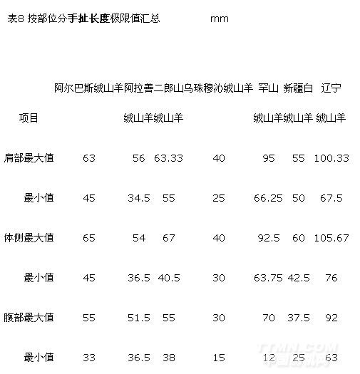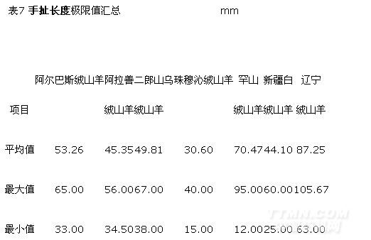 7個(gè)品種中手扯長(zhǎng)度的極大值出現(xiàn)在遼寧絨山羊?yàn)?05.67 m m,極小值出現(xiàn)在罕山絨山羊?yàn)?2.00 mm,最大極差出現(xiàn)在罕山絨山羊?yàn)?3.00 mm,最小極差出現(xiàn)在阿拉善絨山羊?yàn)?1.50 mm;手扯長(zhǎng)度的極大值出現(xiàn)在平均細(xì)度最粗的品種—遼寧絨山羊中。詳見(jiàn)手扯長(zhǎng)度的極限值匯總表7、表8。