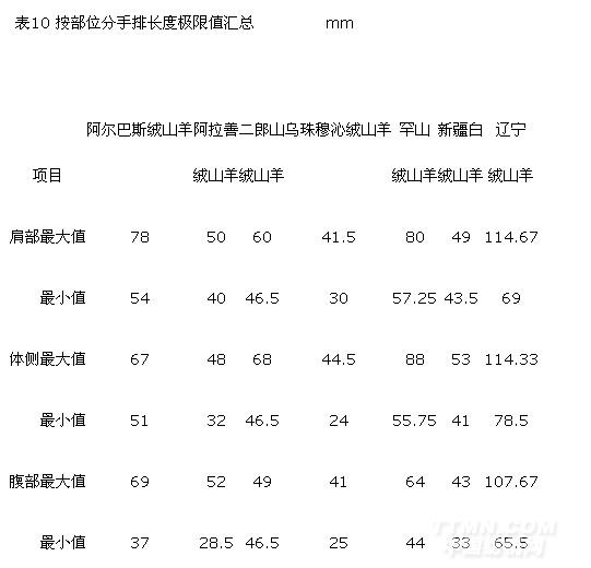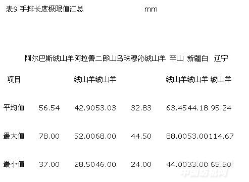 7個(gè)品種中手排長(zhǎng)度的極大值出現(xiàn)在遼寧絨山羊?yàn)?14.67 m m,極小值出現(xiàn)在烏珠穆沁絨山羊?yàn)?4.00 mm,最大極差出現(xiàn)在遼寧絨山羊?yàn)?9.17mm,最小極差出現(xiàn)在烏珠穆沁絨山羊?yàn)?0.50 mm;手排長(zhǎng)度的極大值出現(xiàn)在平均細(xì)度最粗的品種—遼寧絨山羊中。詳見(jiàn)手排長(zhǎng)度的極限值匯總表9、表10。