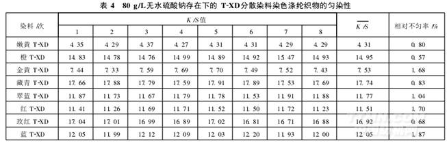 從表4可以看出,在80 g/L無水硫酸鈉存在的條件下, T-XD系列分散染料的染色效果均很好,布面相對不勻率小于2%,說明高濃度電解質的存在對該分散染料無影響,不存在分散染料的耐鹽性問題。