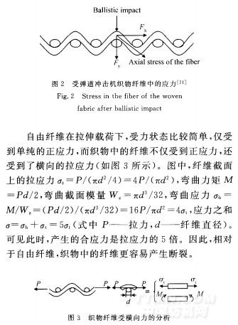 Roylance等'2。。指出,除了纖維的性能之外,織物的組織對材料的防彈性能同樣有著很大的影響。Karahan~等認為,對于機織物,由于交織的作用,紗線必定存在彎曲,當(dāng)織物表面受到?jīng)_擊作用的時候,作用力就會產(chǎn)生水平方向以及垂直方向的分量F和F(如圖2所示),這會導(dǎo)致紗線之間相對滑移嚴重,產(chǎn)生更大創(chuàng)傷。
