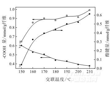 成的酯鍵量的變化情況分別如圖 3 中曲線 1、2、3 所示。隨著交聯(lián)溫度的升高,總的參與酯化反應(yīng) 的羧基量是逐漸增加的,從 150℃時(shí)的 0.646 mmol/g 纖維增加至 210℃時(shí)的 0.993 mmol/g 纖維,粘膠纖維中生成的酯鍵量逐漸增多,而殘留的羧基量逐漸減少。