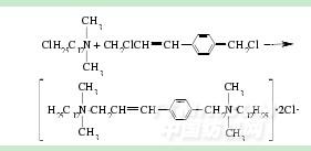 王亞光[25]等合成了一種含芳香鏈聯(lián)結(jié)基的十二叔胺陽離子型Gemini表面活性劑.反應(yīng)中將0.01molN,N-二甲基十二烷基胺和50mL四氫呋喃加入到三口燒瓶中,然后加入0.02mol對芐基烯丙基氯化物,回流反應(yīng)48h,即得產(chǎn)率為95%的白色產(chǎn)物,反應(yīng)式為: