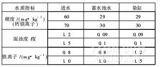 染紗用水取自深井水,將其軟化和凈化后達(dá)到一定的混濁度和硬度指標(biāo)才能使用?;鞚岫缺硎竟饩€透過時(shí),水中懸浮物及膠體物的阻礙程度,以1L蒸餾水中含有1mg懸浮物為一個(gè)混濁單位。水硬度則指水中鈣、鎂離子的總濃度,單位為mg/L。水中鐵離子(參考企業(yè)標(biāo)準(zhǔn)Q/LKBJ/B.2008)及硬度采用試紙快速測試,之后再與樣卡進(jìn)行比對判定。進(jìn)水、軟化凈化水和染缸水的水質(zhì)見表1。