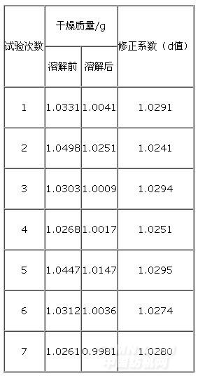 由表1可以計(jì)算出,棉的修正系數(shù)d值的7次試驗(yàn)平均值,結(jié)果為1.01。