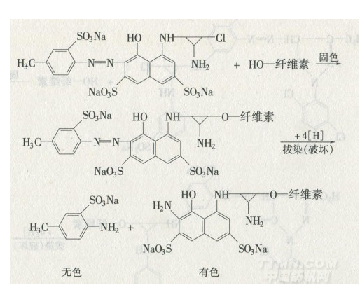 染料母體為偶氮結(jié)構(gòu)的活性染料,當(dāng)染色并固著后用還原劑拔染時,還原劑將偶氮基破壞而分裂成兩個氨基,如果與纖維結(jié)合的部分沒有顏色,那就能獲得良好的拔白效果。例如活性嫩黃K一6G。