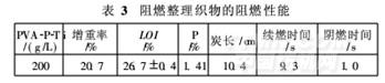 從表3看出,經(jīng)阻燃整理的滌棉織物增重率高于20%,磷含量超過1. 4%,LOI值達(dá)到26%以上,在垂直燃燒測試中能夠達(dá)到高火自熄,說明PVA-P-Ti阻燃劑有較好的阻燃效果。