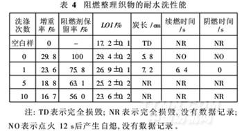 按最佳阻燃液組成(阻燃劑PVA-P-Ti 200 g/L,尿素80 g/L, pH值4)對織物進(jìn)行處理,再按1. 3. 7節(jié)方法測試阻燃織物洗滌1次、5次和10次后的阻燃性能,結(jié)果見表4。