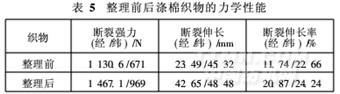 按優(yōu)化阻燃液組成(阻燃劑PVA-P-Ti 200 g/L,尿素80 g/L, pH值4)對織物進(jìn)行處理,按1. 3. 6節(jié)方法測試整理前后滌棉織物的力學(xué)性能,結(jié)果如表5。