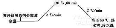 采用相對滌綸織物0.5%、1.O%、1.5%(omf)的紫外線吸收劑,在浴比1:50的染杯中,以2℃/min升溫至130℃,并保溫60rain。升溫曲線如下:
