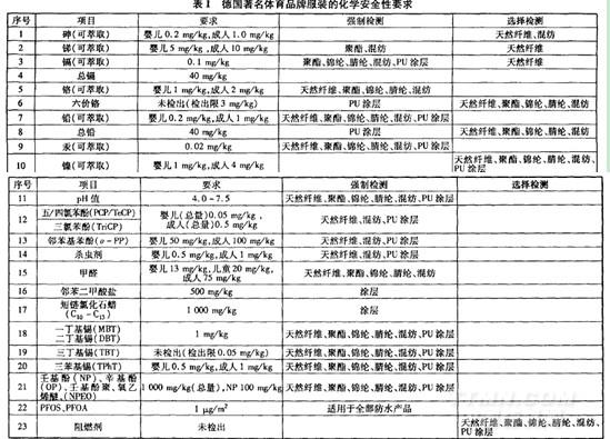德國是目前全世界對紡織品安全性要求較高的國家之一,無論是法規(guī)要求還是品牌要求都比較全面和嚴(yán)格。某世界著名的德國體育品牌服裝的安全質(zhì)量要求比較具有代表性,其對服裝產(chǎn)品制定了較為嚴(yán)格的化學(xué)安全要求,即普通服裝和功能性服裝應(yīng)執(zhí)行相同的化學(xué)安全性標(biāo)準(zhǔn)。表l為該品牌部分可能涉及功能紡織品的化學(xué)安全性要求。