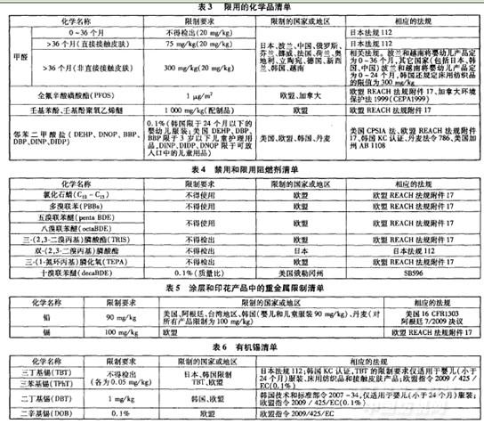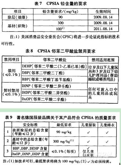 美國(guó)“消費(fèi)品安全改善法(CPSIA)”已于2008年8月14日正式生效,CPSIA法對(duì)兒童(年齡為12歲及以下)產(chǎn)品中鉛和6種鄰苯二甲酸鹽含量有嚴(yán)格的限制要求(表7、表8),并制定了嚴(yán)格的監(jiān)管程序。從功能紡織品的角度來(lái)看,這兩類(lèi)物質(zhì)主要存在于涂層整理,尤其是聚氯乙烯(PVC)涂層整理產(chǎn)品。為了提高PVC涂層的穩(wěn)定性,生產(chǎn)廠家有時(shí)會(huì)在涂層漿料中添加一定數(shù)量的鉛。同樣,鄰苯二甲酸鹽作為增塑劑,會(huì)在PVC涂層加工中被經(jīng)常用來(lái)提高涂層的性能。從目前情況來(lái)看,涂層整理產(chǎn)品中被檢測(cè)出鉛的幾率較小,但卻有不少兒童涂層整理產(chǎn)品被查出鄰苯二甲酸鹽超標(biāo)。從美國(guó)CPSIA的實(shí)施可知,防水涂層、阻燃涂層等涂層紡織產(chǎn)品中的鉛含量將會(huì)受到嚴(yán)格限制對(duì)兒童涂層紡織品中的鄰苯二甲酸鹽含量,將采取與歐洲市場(chǎng)相同的限值。國(guó)際服裝品牌對(duì)銷(xiāo)往美國(guó)市場(chǎng)的紡織產(chǎn)品幾乎全部制定了符合CPSIA的質(zhì)量要求,并出具符合聲明(表9)。