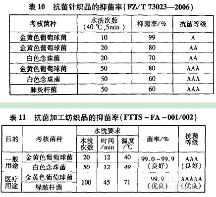 世界各國對抗菌紡織品的評價,一直非常重視抗菌性能的耐久性??咕砑徔椘沸枰谝?guī)定條件下通過多次水洗,然后進行抗菌效果測試和評價。如我國紡織行業(yè)抗菌針織品標準(FZ/T73~3-2006)中,將抗菌針織品按耐洗滌次數(10~50次)及考核菌種數量的多少分為A級、從級、AAA級三個抗菌級別[抗菌耐久性越好,級別越高(表l0)]。臺灣地區(qū)紡拓會標準(兀一FA一001/002)對一般用途和醫(yī)療用途抗菌加工紡織品的耐久性要求更高,洗滌次數、洗滌溫度和洗滌時間更為嚴格(表11)。