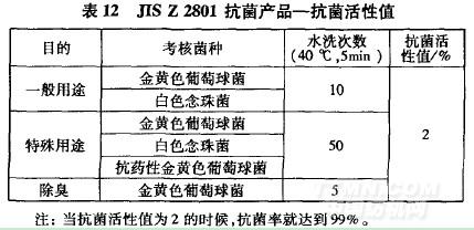 同樣,從日本工業(yè)標準JISz2801抗菌產品抗菌活性及效果試驗標準中,也可以了解到其對耐久性的要求(表12),耐洗次數要求分別達到5—50次。