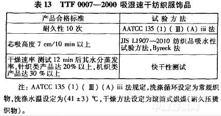 國(guó)際買(mǎi)家和客戶(hù)的質(zhì)量標(biāo)準(zhǔn)往往會(huì)結(jié)合銷(xiāo)售國(guó)家的法律規(guī)定、實(shí)際市場(chǎng)需要和品牌要求,對(duì)功能紡織品的耐久性提出不同的要求??v觀著名國(guó)際品牌和買(mǎi)家的質(zhì)量標(biāo)準(zhǔn),對(duì)功能紡織品的耐久性要求不一,但幾乎皆有耐久性要求(表l4一表16)。英國(guó)瑪莎百貨目前在中國(guó)采購(gòu)約25大類(lèi)功能紡織品,涵蓋抗菌、拒水、防風(fēng)、保溫、吸濕快干、免燙等,其中抗菌家紡產(chǎn)品(sleepsafe)要求原樣和按洗標(biāo)洗滌5次后,樣品對(duì)于肺炎桿菌、金黃色葡萄球菌和大腸桿菌的殺菌率不得少于99.O%??咕棶a(chǎn)品(skinkind)要求測(cè)試按洗標(biāo)洗滌5次后的抗菌效果。純棉吸濕排汗產(chǎn)品(realcoolcotton)則要求分別進(jìn)行30次(休閑服、男式和兒童T恤衫)和2O次(休閑褲)水洗后,測(cè)試產(chǎn)品的水分蒸發(fā)和毛效。拒水(waterrepellent)和防雨(storm wear)產(chǎn)品的耐久性要求是,外衣按洗標(biāo)洗滌和烘干10次,其它可洗滌產(chǎn)品必須按洗標(biāo)洗滌和烘干20次。僅可干洗的產(chǎn)品則要5次干洗,僅可干洗的外衣應(yīng)進(jìn)行4次干洗。吸濕排汗抗菌產(chǎn)品(coolandfresh)有洗滌20次的耐久性要求,柔軟吸濕排汗抗菌產(chǎn)品(softcoolfresh)有40次的耐久性要求。防雨產(chǎn)品(showerresistant)的耐久性要求是,按洗標(biāo)洗滌和干燥3次(可機(jī)洗外衣)和10次(其它產(chǎn)品),或2次(外衣)和5次(其它產(chǎn)品)干洗。由此可見(jiàn),耐久性是功能紡織品不容忽視的國(guó)際買(mǎi)家要求,而這也恰恰是功能紡織品在開(kāi)發(fā)和生產(chǎn)中應(yīng)該進(jìn)一步引起重視的問(wèn)題。