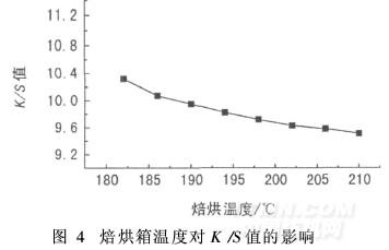 由圖4可知,當(dāng)溫度從184℃提高到210℃時(shí),染色織帶的K/S值逐漸變小,顏色明顯變淺。試驗(yàn)表明,焙烘箱左中右溫度差異超過(guò)2℃,織帶的顏色明顯變化。所以,染色生產(chǎn)時(shí)一定要確保焙烘箱溫度均勻。