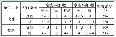 從表4可以看出,色媒體改性絲/棉織物染色牢度與傳統(tǒng)工藝相當(dāng);強力保留率明顯優(yōu)于傳統(tǒng)染色工藝。這是由于染色過程中沒有使用鹽和堿,纖維的損傷程度減小。
