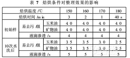 采用易去污整理劑PFSR-2 80 g/L,二浸一軋,軋余率60%,預(yù)烘溫度110℃,時(shí)間2 min,焙烘條件對整理效果的影響見表7。