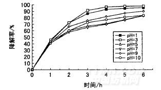 在玻璃皿中放人50mL的40mg/L酸性橙Ⅱ溶液,并將0.441mol/L TiO2整理后的基布浸入溶液中,用1mol/L鹽酸溶液和1mol/LNaOH調(diào)節(jié)溶液pH值分別為1,3,5,7,9,10,然后置于紫外燈下進行光催化降解試驗??疾烊芤簆H值對催化活性的影響,結(jié)果見圖6。