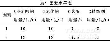 在上述試驗所確定的參考值范圍內(nèi),設計正交實驗以進一步優(yōu)化工藝參數(shù)。將影響木質(zhì)素去除的幾個重要的因素(精練劑濃度和亞硫酸鈉、硫化鈉、蒽醌的用量)列出因素水平表,每個因素取兩個水平,如下表4所示。