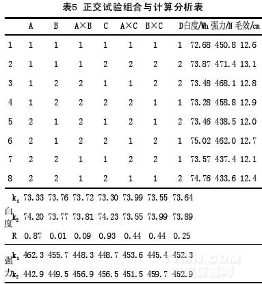 從工藝上分析,因素A與B,A與C,B與C之間可能會有交互作用,因為它們對于木質(zhì)素的去除都有一定的作用。利用L8(27),將實驗設計如下表5所示,探討各因素對織物性能的影響