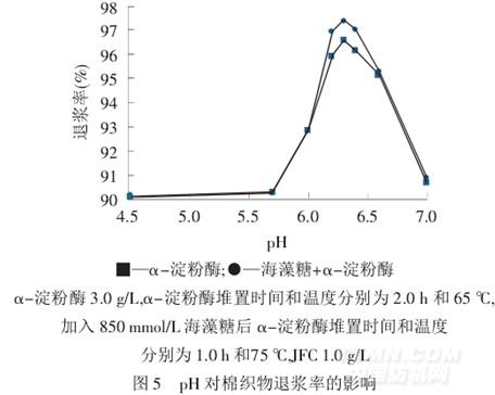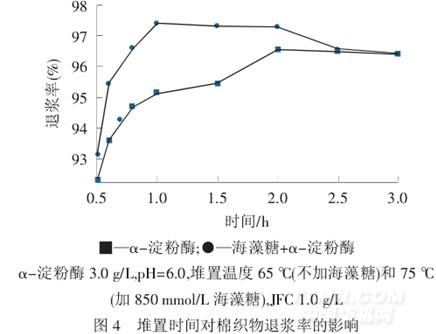 從圖3 可以發(fā)現(xiàn),隨著堆置溫度的升高,2 種工藝條件下,棉織物的退漿率均呈現(xiàn)先升后降趨勢(shì).65 ℃時(shí),α-淀粉酶處理棉織物的退漿率最高,之后,隨著溫度升高,退漿率降低.與α-淀粉酶退漿效果比較,加入海藻糖后,其最佳堆置溫度提高到75 ℃.可見(jiàn),海藻糖的加入能有效提高α-淀粉酶的熱穩(wěn)定性,且使得α-淀粉酶在較高溫度下能繼續(xù)保持活力.所以,在有海藻糖的α-淀粉酶退漿工藝中,其最佳堆置溫度可以設(shè)為75 ℃.
